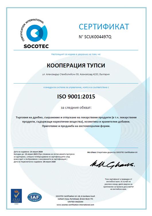 Вие сте в: Начало / За нас За нас Интернет страницата (сайтът) www.apteka1.eu е интернет аптека по смисъла на ЗЛПХМ и е собственост на Кооперация Тупси , Асеновград с адрес на управление Асеновград, бул. Ал. Стамболийски 39 , вписано в търговският регистър с ЕИК BG 000619159, управител – Иван Иванов управител на Аптека 1 – маг. фармацевт Стойчо Червенлиев, наричани в тези условия за краткост www.apteka1.eu или Аптека 1. Аптека 1 притежава разрешение № 3519/ 20.09.2010г., по смисъла на чл. 228, ал. 1 от Закона за лекарствените продукти в хуманната медицина, за търговия на дребно с лекарствени продукти в аптеката на дружеството. Аптеката е регистрирана по ЗДДС и работи в съответствие с изискванията на Закона за защита на потребителите, Закона за защита на личните данни, Закона за електронната търговия, Закона за медицинските изделия, Закона за здравето, Закона за храните, Наредба № 47/2004 за изискванията към хранителните добавки и другите нормативни актове, уреждащи предлагането на продуктите, описани в www.apteka1.eu . Адрес по регистрация : България, обл. Пловдив, Асеновград, бул. Ал. Стамболийски 39 адрес за кореспонденция : България, обл. Пловдив, Асеновград, бул. Ал. Стамболийски 39 Аптека 1 телефон 0887209927 и 0033162619, е-мейл: office@apteka1.eu, Контролът върху дейността на Аптеката и www.apteka1.eu се осъществява от Изпълнителната агенция по лекарствата, град София, 1303, ул. Дамян Груев 8, тел. + 359 2 890 3555, факс: + 359 2 8903434. СЕРТИФИКАТИ